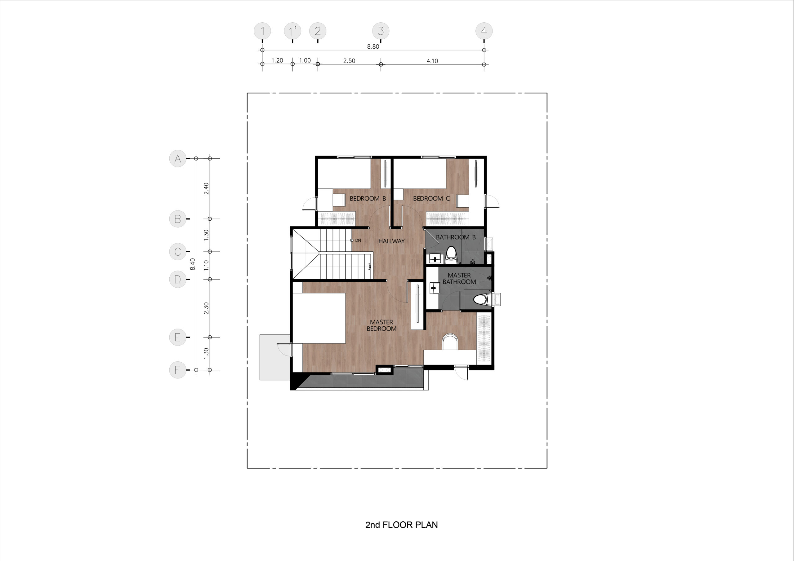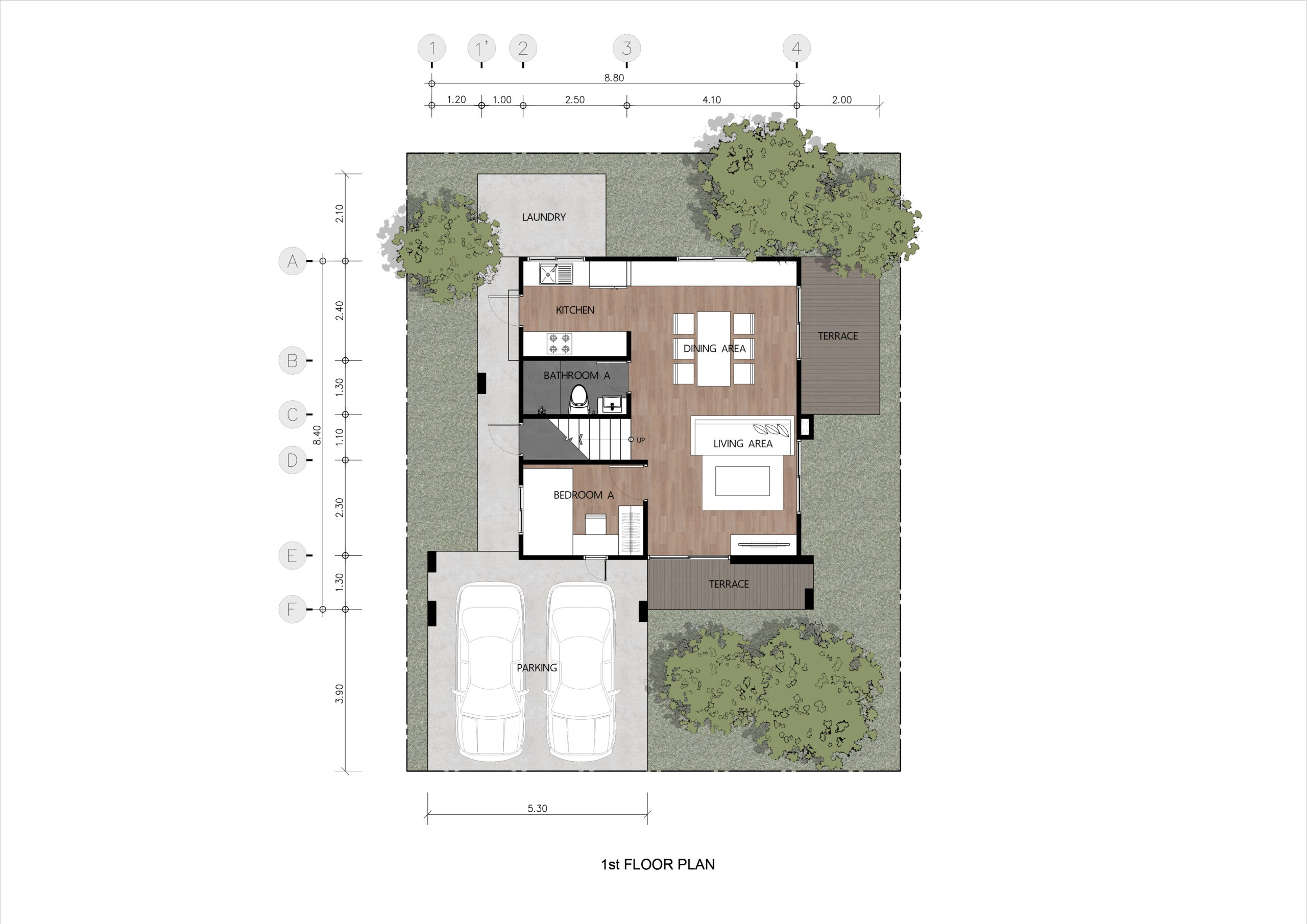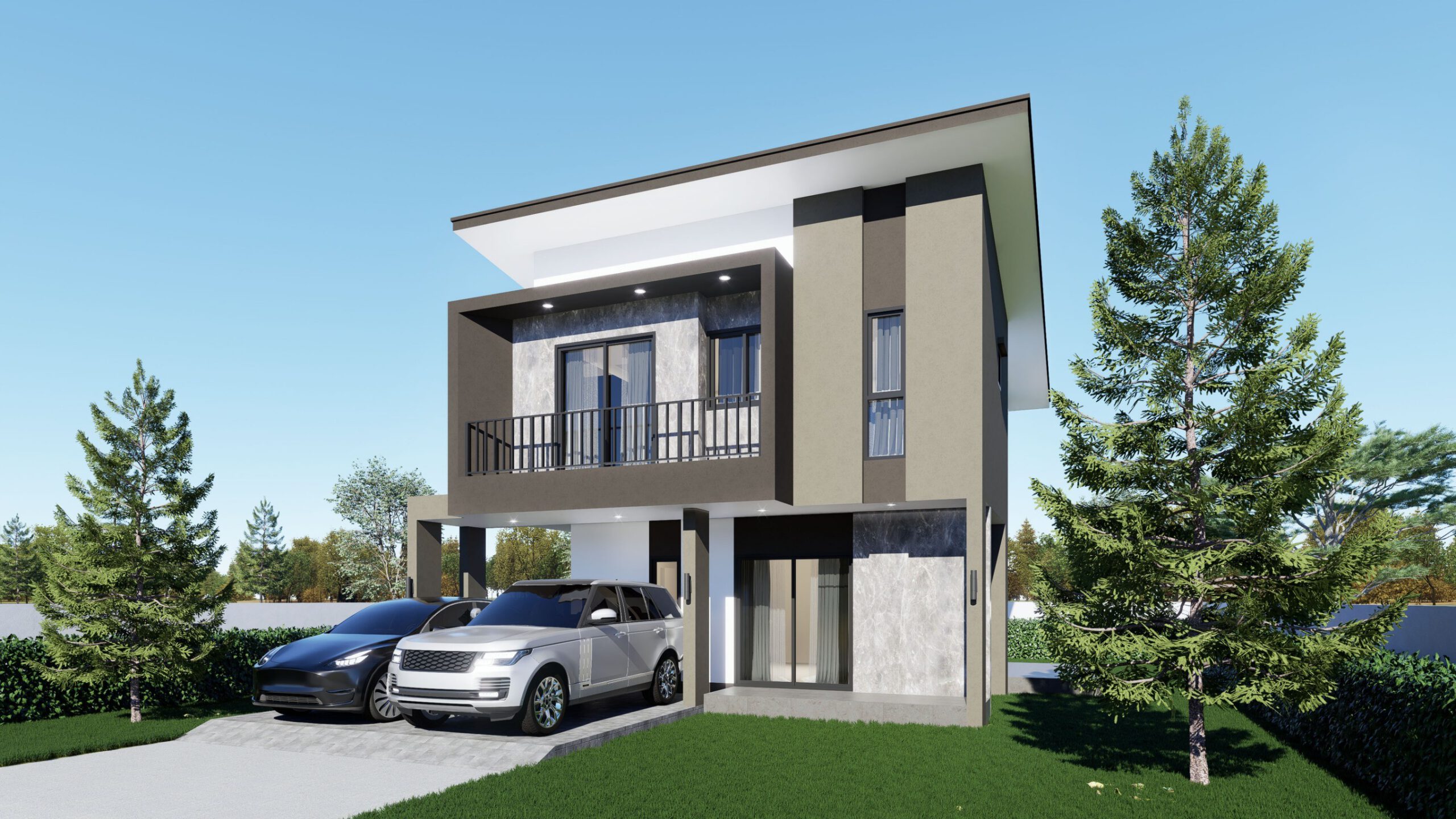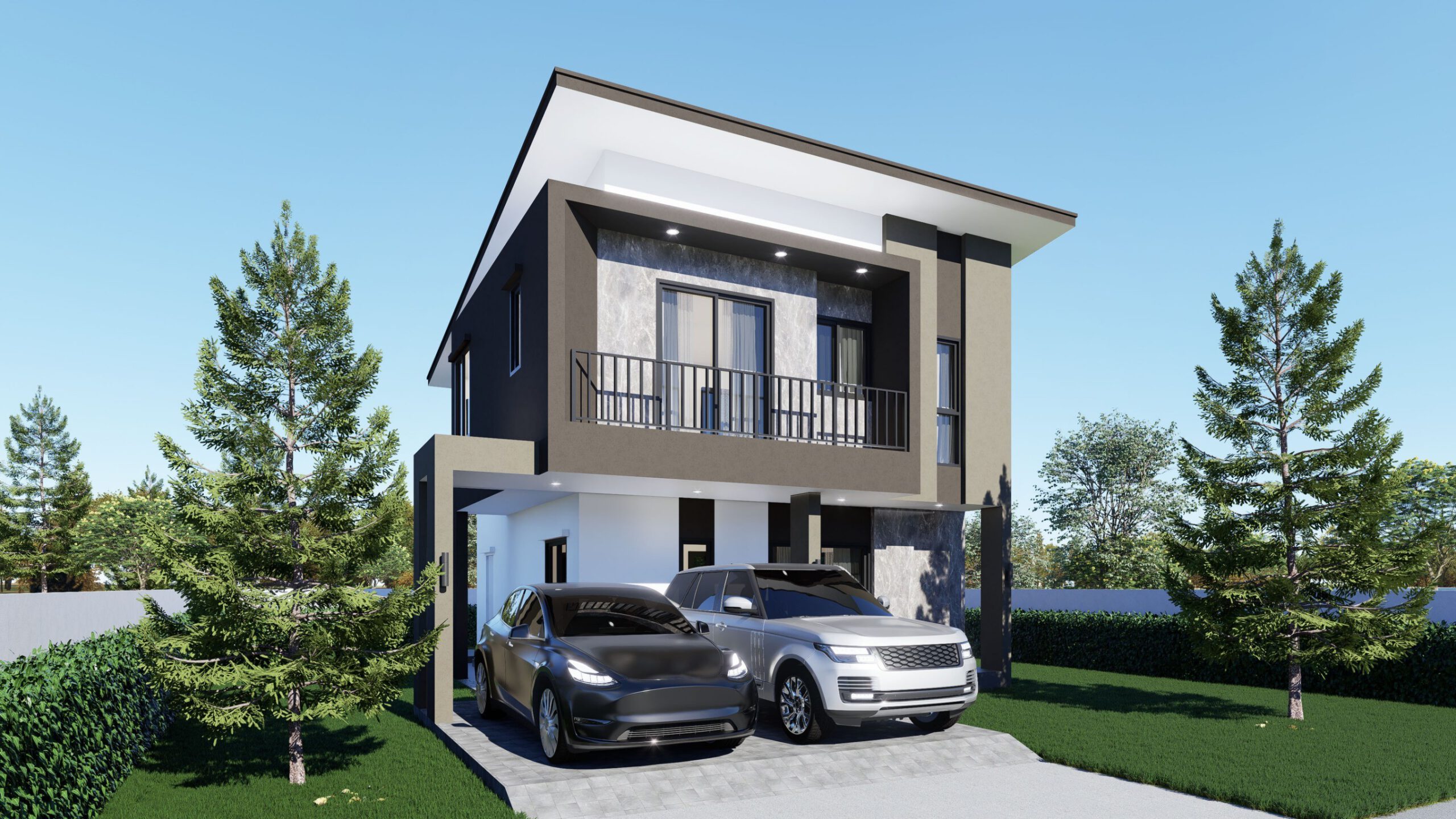 บ้าน 2 ชั้น 4 ห้องนอน 3 ห้องน้ำ 1 ห้องรับแขก 1 ห้องรับประทานอาหาร 1 ห้องครัว 2 ที่จอดรถ ขนาด 8.80×8.40 เมตร พื้นที่ใช้สอย 172 ตารางเมตร เหมาะสำหรับที่ดิน 12.80×16.30 เมตร