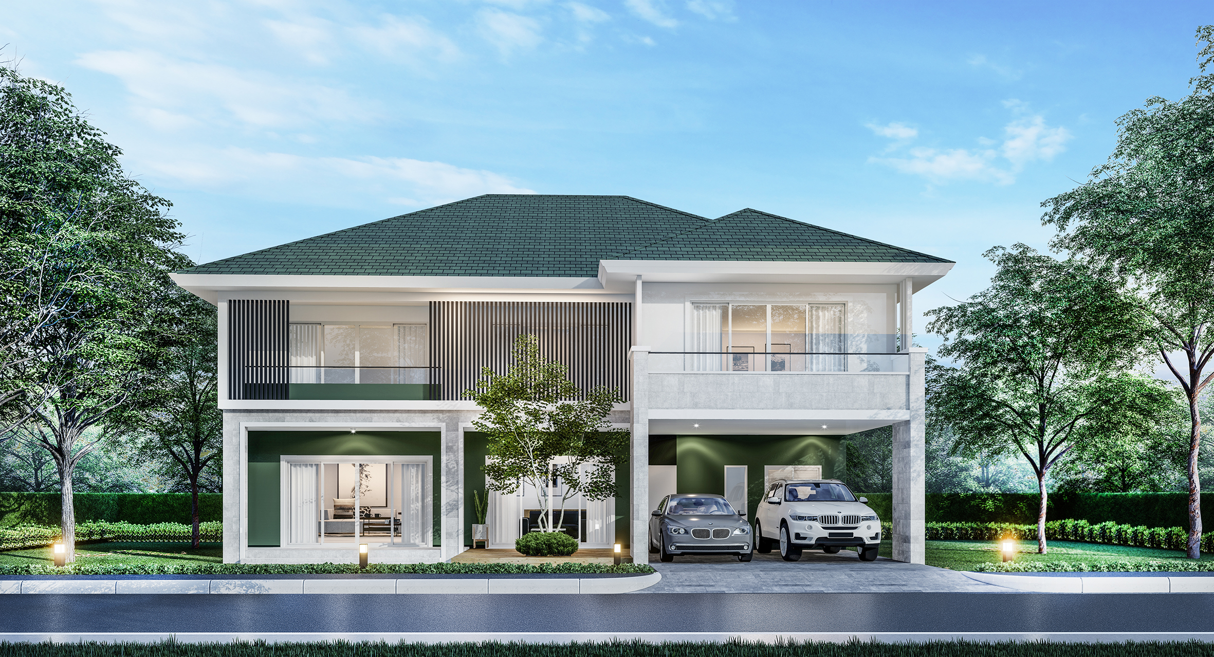 บ้าน 2 ชั้น 3 ห้องนอน 5 ห้องน้ำ 1 ห้องรับแขก 1 ห้องรับประทานอาหาร 1 ห้องพักผ่อน 1 ห้องทำงาน 1 ห้องครัว 1 ห้องแม่บ้าน 2 ที่จอดรถ ขนาด 15.00×13.70 เมตร พื้นที่ใช้สอย 414 ตารางเมตร เหมาะสำหรับที่ดิน 19.00 x17.50 เมตร